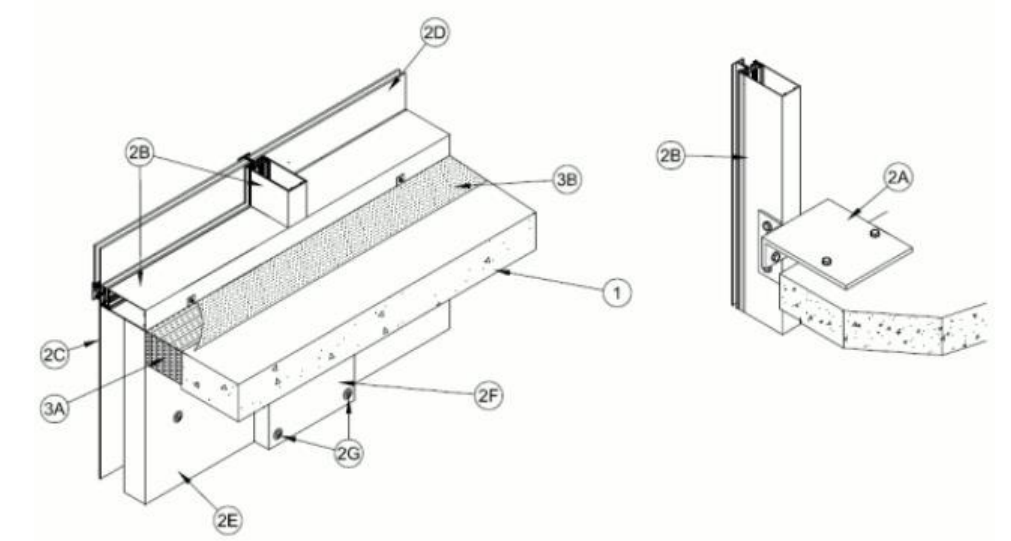 A1. Mullion Mounting Brackets — As an alternate to Item 2A, min 8 in. (203 mm) wide by 3/4 in. (19 mm) thick extruded aluminum Halfen mounting brackets with one nom 2 in. (51 mm) high leg for support and attachment of mullion and with one leg at least 6 in. (152 mm) longer than width of linear opening between floor assembly and mullion. Mounting bracket attached to top of floor with two min 1/2 in. (13 mm) diam steel masonry anchors in conjunction with washer plates supplied with mounting bracket.