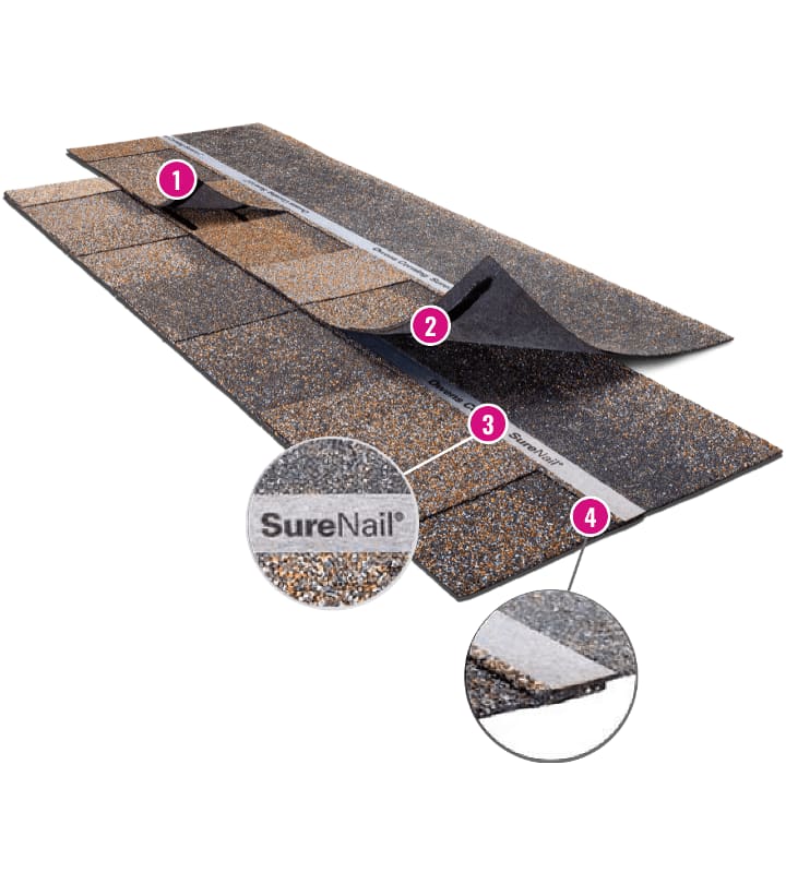 It’s easy to see the patented SureNail® Technology exclusively on Duration® Series shingles. It’s the wide, highly visible engineered fabric in the nailing area. SureNail® Technology helps create a clear, reinforced target for nailing shingles with ease.