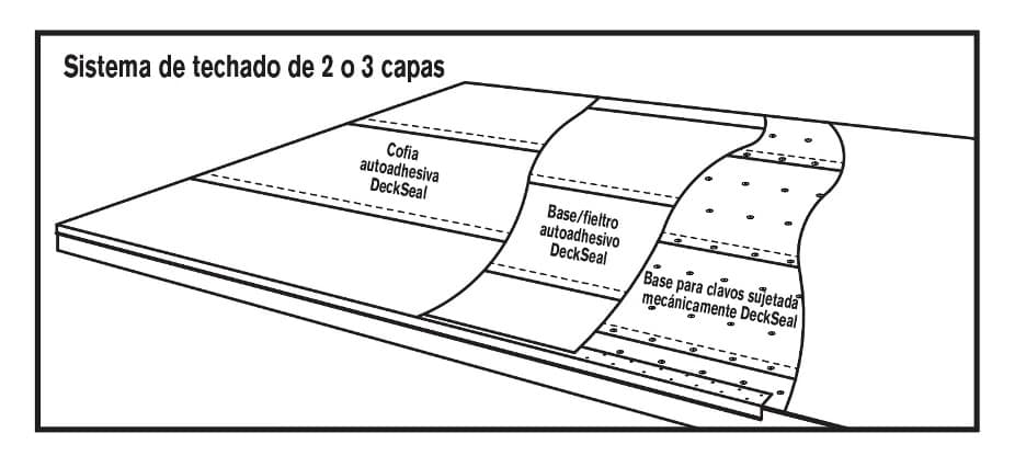Owens Corning Roofing recomienda cumplir con las normas de seguridad de la Administración de Seguridad y Salud Ocupacional (Occupational Safety and Health Administration, OSHA). La Base/fieltro autoadhesivo DeckSeal es un producto diseñado para instalarse en inclinaciones de techos de entre 1/4:12 y 2:12 y se debe aplicar directamente sobre un contrachapado o tableros de fibra orientada (OSB) para uso exterior cuando se usa como placa de base en un sistema de 2 fieltros o sobre la Base para clavos sujetada mecánicamente Owens Corning® DeckSeal cuando se usa como segundo fieltro en un sistema de 3 fieltros.