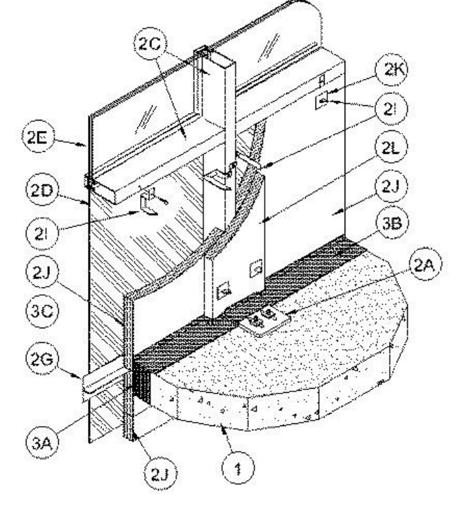 C. Framing — The one-piece or split rectangular tubing mullions (vertical members) and transoms (horizontal members) shall be min 2-1/2 in. wide by 6 in. deep and shall be formed from min 0.125 in. thick aluminum. Mullions spaced max 60 in. OC and secured to mullion anchor plates (Item 2A) with mounting clips (Item 2B) at each floor level. Interior face of mullions to be max 4 in. from edge of floor assembly. Transoms to be spaced min 69 in. OC. The minimum height from the top of the floor to the bottom of the vision panel sill is 33 in.