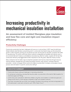 The comparison trial designed featured a range of ¾-inch, 1-inch and 2-inch copper piping installed at different heights in bent, horizontal and vertical placements. A two-person crew of pipe insulators who had about five years of experience installing insulation was asked to install three different types of insulation on the piping during a three-day window. One type of insulation was installed each day using standard tools and practices. Their performance was measured and the number of productive labor-hours per task were calculated.