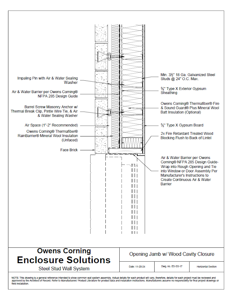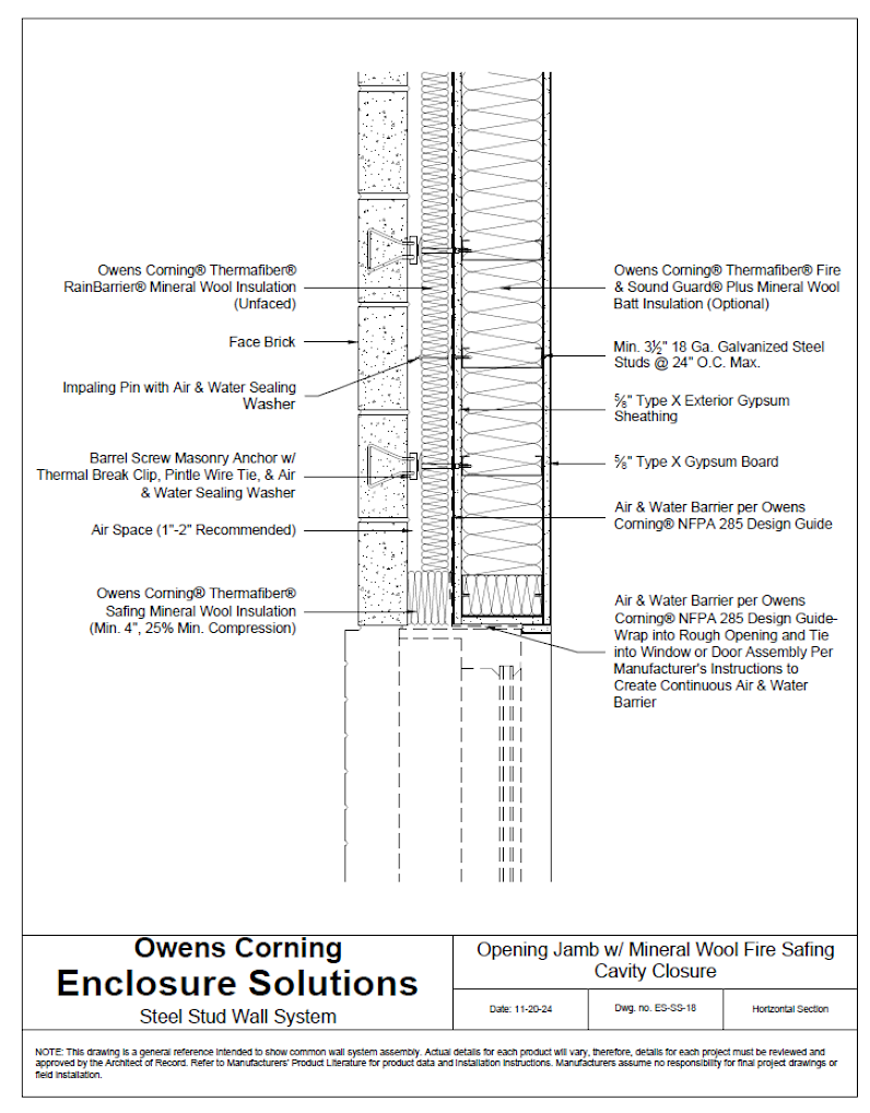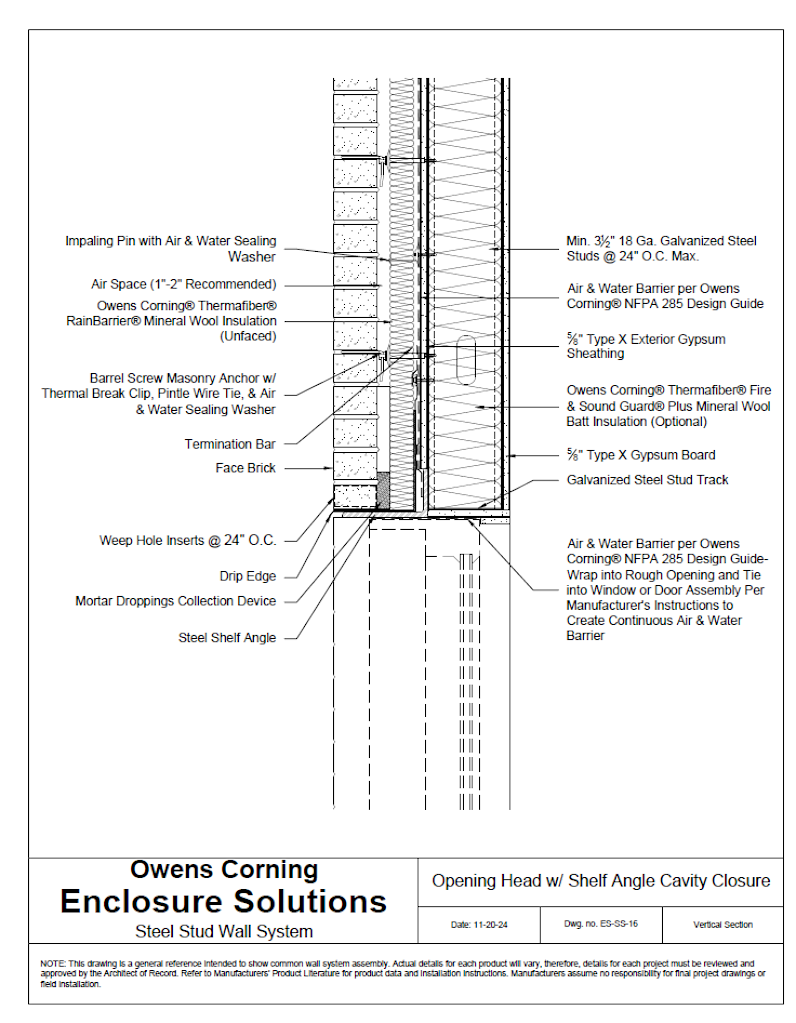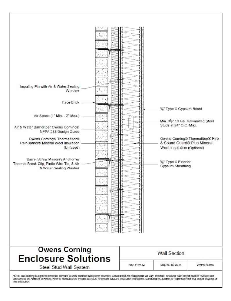 This Enclosure Solutions Wall System includes steel stud structure with masonry veneer, exterior gypsum sheathing, mineral wool continuous insulation, & mineral wool cavity batt insulation. By selecting correct components, it complies with NFPA 285 (fire), ASTM E119 (fire), ASTM E2357 (air), & ASTM E331 (water).