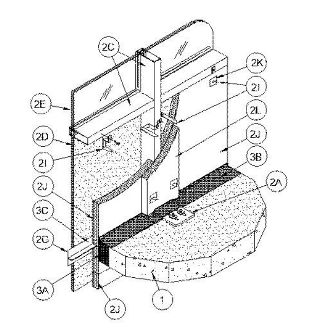 J. Curtain Wall Insulation* — Min 2 in. thick mineral wool batt insulation faced on one side with aluminum foil/scrim vapor retarder, supplied in min 36 in. wide batts. Insulation batts to be installed with no vertical seams. A horizontal seam is to be located 7 to 9 in. below the stem of the T Bar in each spandrel area and is to be sealed with aluminum foil tape. In the spandrel area beneath the stem of the T Bar, insulation panels tightly-fitted between vertical mullions and between the stem of the T Bar (Item 2G) and the transom, flush with the interior surface of framing. Insulation panels impaled on vertical and horizontal hangers (Item 2I) and secured in place with nom 2 by 2 in. steel locking washers (Item 2K). THERMAFIBER INC — Firespan 90