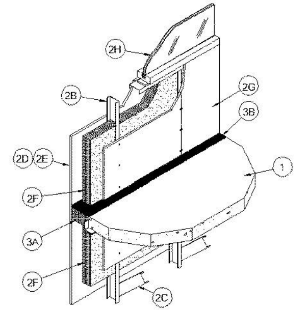 A. Mounting Angles — (Not Shown) - Min 3 in. long angles with one nom 4 in. leg for attachment to edge of floor assembly and with one leg approx 2-1/2 to 3 in. longer than distance to interior face of steel studs. Angles to be formed of min 1/8 in. thick steel. Angles welded to cast-in-place structural steel angle at edge of floor assembly (Item 1) on one side of each steel stud (Item 2B) at each floor level. Top edge of each mounting angle to be recessed 1 to 1-1/2 in. below top surface of floor.