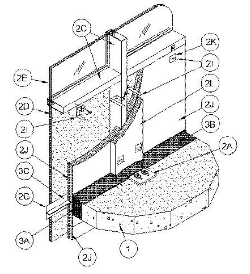 J. Curtain Wall Insulation* — Min 2 in. thick mineral wool batt insulation faced on one side with aluminum foil/scrim vapor retarder, supplied in min 36 in. wide batts. Insulation batts to be installed with no vertical seams. A horizontal seam is to be located 7 to 9 in. below the stem of the T Bar in each spandrel area and is to be sealed with aluminum foil tape. In the spandrel area beneath the stem of the T Bar, insulation panels tightly-fitted between vertical mullions and between the stem of the T Bar (Item 2G) and the transom, flush with the interior surface of framing. Insulation panels impaled on vertical and horizontal hangers (Item 2I) and secured in place with nom 2 by 2 in. steel locking washers (Item 2K). THERMAFIBER INC — Firespan 90